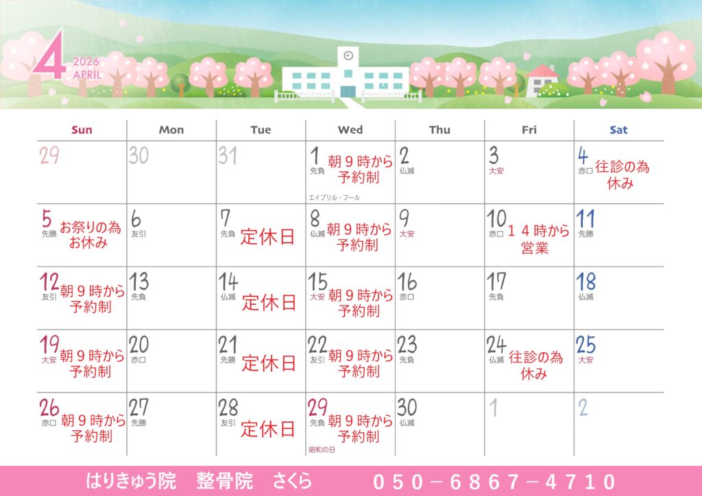 いつもありがとうございます。4月はお祭りがあるので、5日はお休みです。10日は14時から施術をさせて頂きますのでよろしくお願い致します。